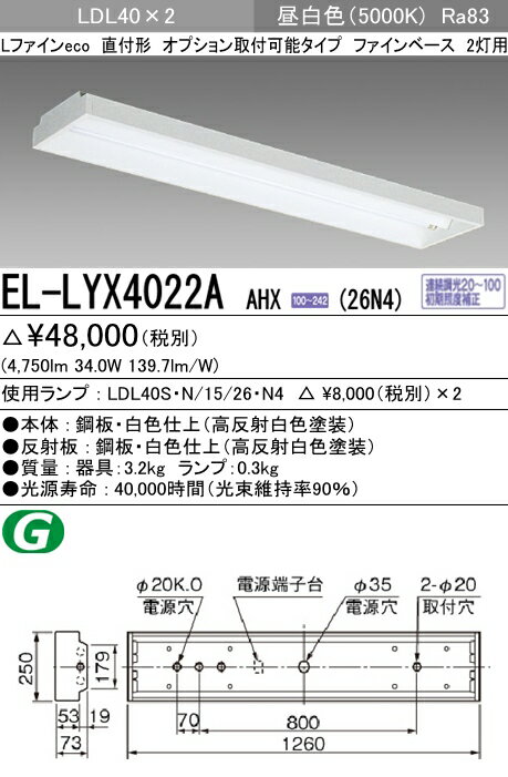 EL-LYX4022A AHX(26N4)LDL40 オプション取付け可能タイプ2灯用 ファインベース連続調光対応 2600lmクラスランプ付(昼白色)直管LEDランプ搭載ベースライト 直付形三菱電機 施設照明